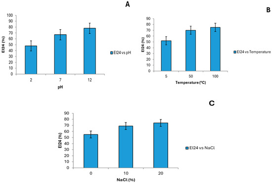 40], which reported that microbial biosurfactants tend to exhibit enhanced stability in both acidic and alkaline environments—making them suitable for processes involving wide pH fluctuations. The slight reduction in activity at extreme pH levels may be associated with conformational changes in the molecular structure of the bioemulsifier that hinder its interaction with oily phases.