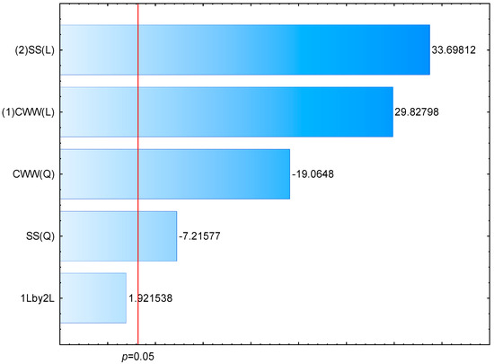 Figure 4, soluble starch (SS%) had the strongest positive effect on the response variable, with a standardized effect value of 7.04, indicating that it was the most influential factor in enhancing bioemulsifier production. Cassava wastewater (CWW%), representing the proportion of liquid effluent derived from cassava processing, also had a significant impact, with a standardized effect of 6.23—reinforcing its potential as a low-cost and sustainable carbon source. In the Pareto chart, the suffix (L) refers to the linear effect of each factor, (Q) denotes the quadratic effect, and 1Lby2L indicates the linear interaction between the two variables. These abbreviations help identify the individual and interactive contributions of each factor to the observed response.