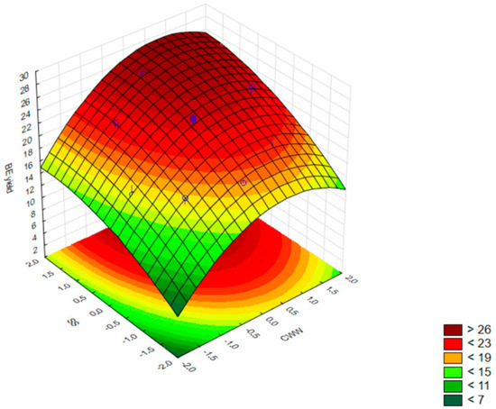 The central region of the surface—ranging from 4.5% to 7.0% soluble starch and 1.3% to 2.6% cassava wastewater—exhibited a steep increase in bioemulsifier production, with yields exceeding 26%. In contrast, lower concentrations of both substrates resulted in a marked reduction in yield, likely due to nutrient limitations affecting microbial growth and biosynthetic capacity.