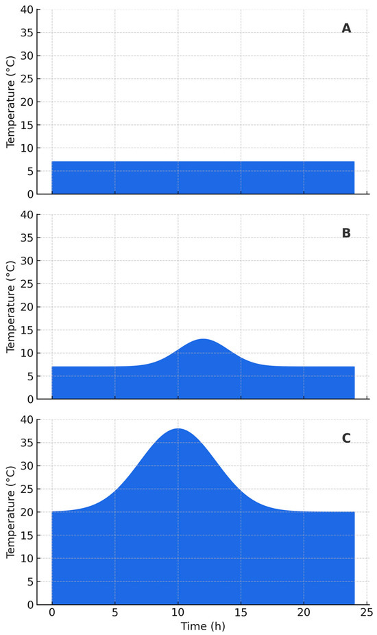 Dynamic temperature profiles based on hourly variation over a period of one day to simulate realistic temperature conditions during logistics for distribution and display for sale. (A)—constant refrigeration at 7 °C; (B)—refrigeration with excessive temperature; (C)—room temperature.
