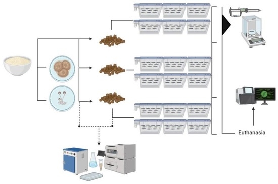 - Pastore, S.C.G.; Gaiotto, J.R.; Ribeiro, F.A.S.; Nunes, A.J.P. Boas práticas de fabricação e formulação de rações para peixes. In NutriAqua: Nutrição e Alimentação de Espécies de Interesse Para a Aquicultura Brasileira; Fracalossi, D.M., Cyrino, J.E.P., Eds.; Sociedade Brasileira de Aquicultura e Biologia Aquática: Florianópolis, Brazil, 2016; Volume 1, Chapter 16; pp. 295–346. [Google Scholar]