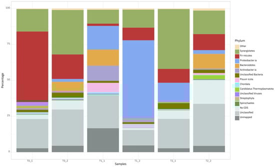 Relative abundance of microorganisms found by phylum in each sample. Two repetitions per treatment: control (T0_1 and T0_2); low (T1_1 and T1_2), and high (T2_1 and T2_2), respectively.