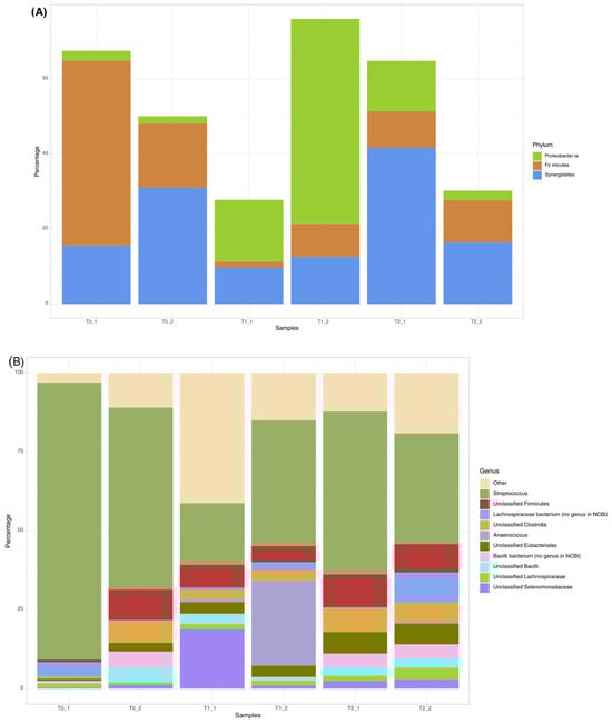 The most abundant phylum in T1 Low was Proteobacteria (Figure 1), which is characterized by its utilization of proteins in the rumen [] and has been considered as a secondary fermenter; that is, it utilizes metabolites produced from the fermentation of other microorganisms []. This proportion is confirmed by Figure 2C, which contrasts the most abundant phyla across the three treatments. In treatment T1 (Low), sample T1_2, which is the second repetition, was found to predominantly contain the Morganellaceae family (Figure A4), while sample T1_1 showed greater variability in terms of populations of families within the Proteobacteria phylum, such as Pseudonomaceae and Nocardiaceae. Of the treatments performed, it is the most distinct in terms of taxonomic composition between replicates. The most abundant genera in T1 within the Proteobacteria phylum were Proteus and Pseudomonas (Figure A2). Both have been studied in various niches, and within the ruminal environment, they are documented to collaborate in acid formation from simple sugars and secrete proteases that assist in protein breakdown []. Previous fermentation studies determined that the protein content in the treatments was approximately 20%, which suggests that this concentration of crude protein could stimulate an increase in these genera [].