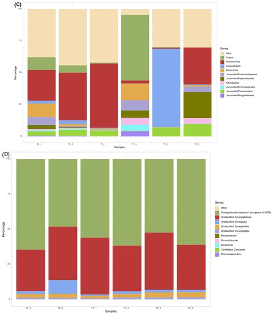 (A) The relative abundances of the main phyla found by treatment: Firmicutes for T0_1 and T0_2: Control, for T1_1 and T1_2: Low, and Synergistetes for T2_1 and T2_2: High. (B) The relative abundances of the genera of the phylum Firmicutes. (C) The relative abundances of the genera belonging to the phylum Proteobacteria. (D) The relative abundances of the genera of the phylum Synergistetes.