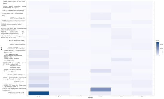 One of the advantages of metatranscriptomics is that it allows the identification of current transcripts in real time; in other words, it can precisely describe how an environment is functioning at a specific moment []. In Figure 3, the principal mapped transcripts and their relative abundances in transcripts per million can be observed. Notably, the Thermal unstable elongation factor (K02358) is found in higher proportions in T0, which is the control. This factor functions by binding the aminoacyl of transfer RNA, making it essential for protein translation []. In this case, the abundance of this mRNA suggests that the thermal unstable elongation factor is required in large quantities during this phase of fermentation under the conditions of T0. Cold shock proteins are those whose domains interact directly with genetic material to modulate its expression, facilitating cell survival or homeostasis [].