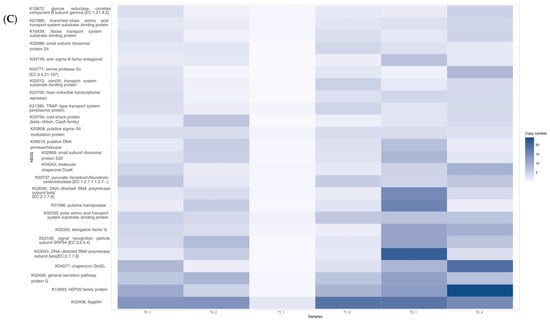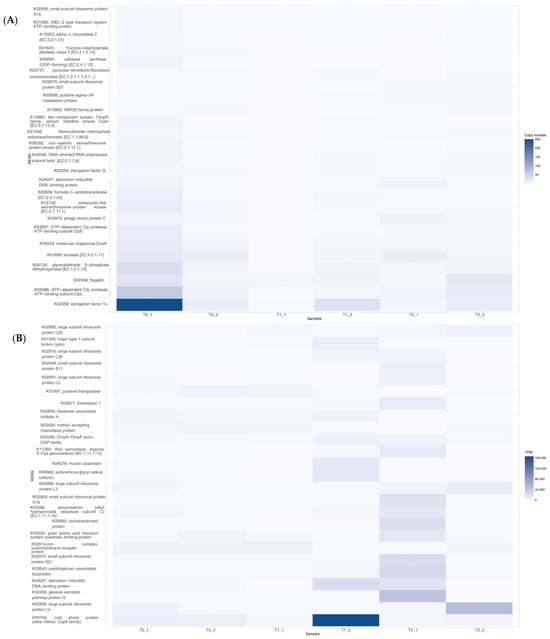 In Figure 4B, the most abundant mRNAs from the Proteobacteria phylum, which is predominant in T1 Low, are displayed. The most abundant mRNA is the cold shock protein, which serves to preserve genetic material. Additionally, there is an abundant, though less evident, mRNA from K04047, a DNA-binding protein involved in starvation response. This protein is translated when the cell harboring it, especially Gram-negative bacteria, behaves as Proteobacteria under stress conditions [], to protect itself and endure across generations despite the hostile environment. In Figure 4C, the most abundant transcripts from the Synergistetes genus are shown, and in general, similar patterns are observed across all three treatments, which is further supported by Figure 2D, where the taxon abundances also appear very similar. However, it is noteworthy that in T1 Low, the messenger from K01952 phosphoribosyl-formylglycinamide synthase (EC 6.3.5.3), involved in metabolic processes for purine synthesis [], is overrepresented.