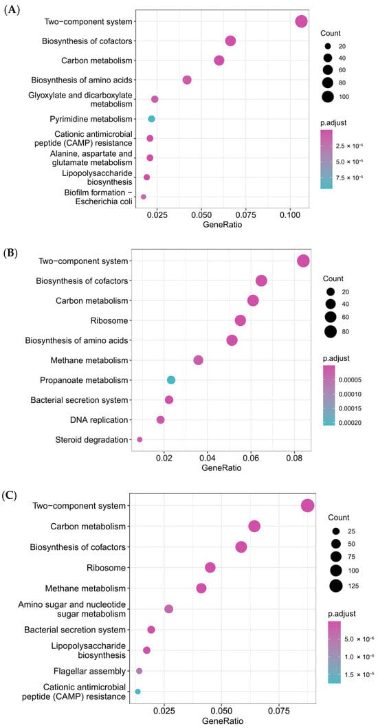 Functional enrichment analysis using the KEGG database, with a padj ≤ 0.05, using the BH procedure. (A) Overrepresentation analysis for group T0 versus T1. (B) Overrepresentation analysis for group T0 versus T2. (C) Overrepresentation analysis for group T1 versus T2.