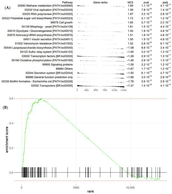 To strengthen the analysis, a Gene Set Enrichment Analysis (GSEA) was conducted [], which classifies all genes in the dataset based on their differential expression and tests whether genes within a set are enriched. In other words, it takes into account the distribution of gene expression changes within a dataset. In this case, the pairwise comparisons were performed again: T0 vs. T1 (Figure 6A,B), T0 vs. T2 (Figure 7A), and T1 vs. T2 (Figure 7B), showing significantly enriched metabolic pathways with a p-value ≤ 0.05, based on the gene sets generated from the evaluated sequences. In Figure 6A, the methane metabolism pathway is highlighted, suggesting that the set of genes involved in this metabolism is significantly represented in T1 compared to T0, the control []. This is consistent with the results obtained from the in vitro fermentation evaluation [].