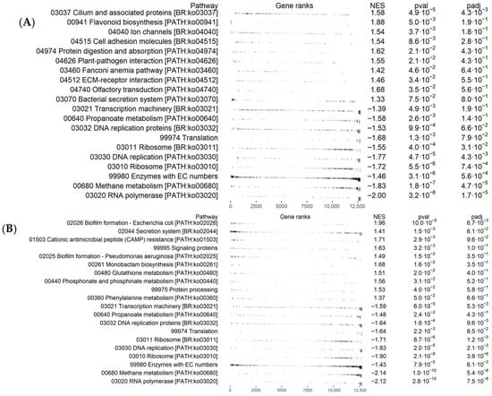 To further strengthen these findings, a Gene Set Enrichment Analysis (GSEA) [] was performed. This method classifies all the genes in the dataset based on their differential expression and checks whether the genes in a particular set are enriched, taking into account the distribution of gene expression changes in the dataset. In this case, pairwise comparisons were made: T0 vs. T1 (Figure 6A,B), T0 vs. T2 (Figure 7A), and T1 vs. T2 (Figure 7B). The results show the significantly enriched metabolic pathways with a p-value ≤ 0.00041 for each gene set, generated from the evaluated sequences.