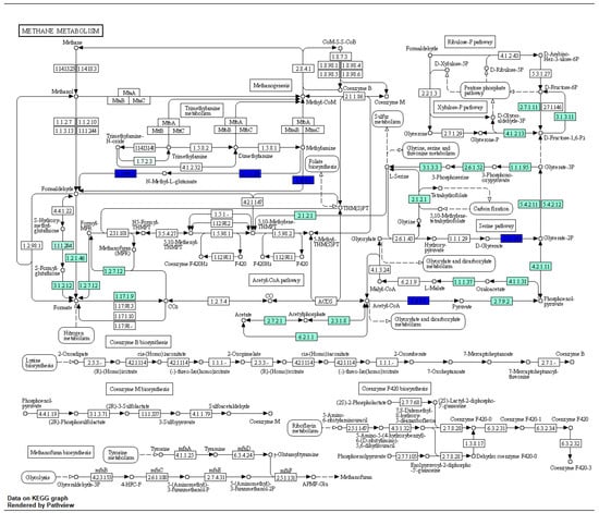 Methane metabolic pathway with overexpressed enzymes (navy blue) and underexpressed enzymes (turquoise) between T0 and T1, based on their relative abundances.