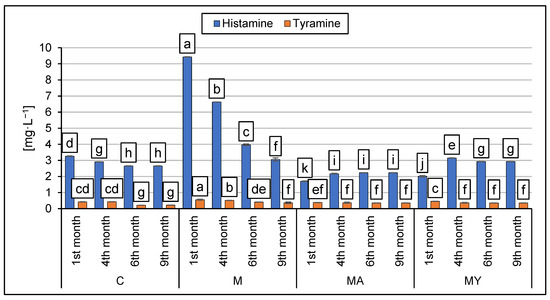 The results of HIS and TYR determination in experimental wine samples during phases of production (mean ± SD). C: the control group of wine samples. M: wine samples that underwent maceration in wine production technology. MA: wine samples that underwent maceration in wine production technology with the addition of ascorbic acid. MY: wine samples that underwent maceration in wine production technology with an added yeast culture. a–j: the means in columns with a different superscript letter are statistically different (p < 0.05).