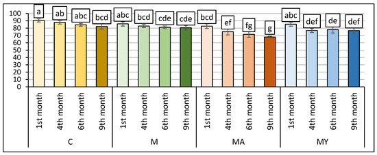 The total score of sensory evaluation of the experimental wine samples with the hedonic 100-point OIV method (means ± SD). C: the control group of wine samples. M: wine samples that underwent maceration in wine production technology. MA: wine samples that underwent maceration in wine production technology with the addition of the ascorbic acid. MY: wine samples that underwent maceration in wine production technology with an added yeast culture. a–g: the means in columns with a different superscript letter are statistically different (p < 0.05).