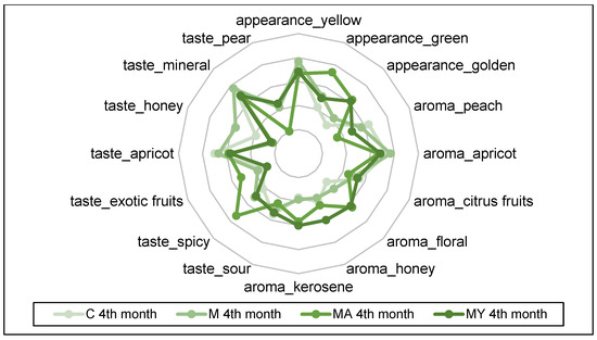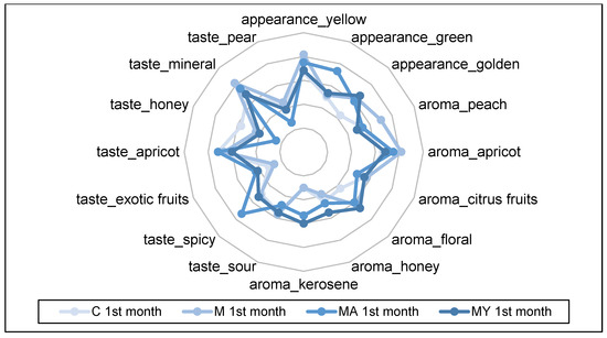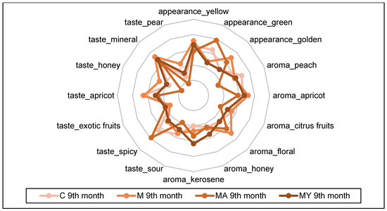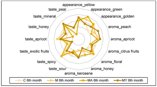 The spider plots in Figure 3, Figure 4, Figure 5 and Figure 6 show the QDA results of the of experimental wine samples during maturation periods. The influence of maceration procedures and their modifications had significant effects on each sensory attribute of the performed QDA (p < 0.001). On the other hand, period of wine maturation affected significantly only the following attributes: yellow appearance (p < 0.01), apricot (p < 0.01), and citrus fruit aroma (p < 0.05), sour (p < 0.05), apricot (p < 0.01), mineral (p < 0.01), and pear taste (p < 0.01).