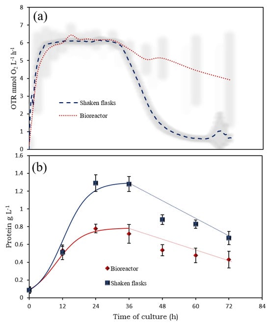 Figure 2b shows the growth kinetics, measured as the protein concentration in the cultures, in the 3 L bioreactor compared with previous results reported for shaken flasks []. It can be observed that, although during the first 36 h of culture the OTR behavior was replicated in the 3 L bioreactor, the growth kinetics was significantly different from those achieved in the shaken flasks.