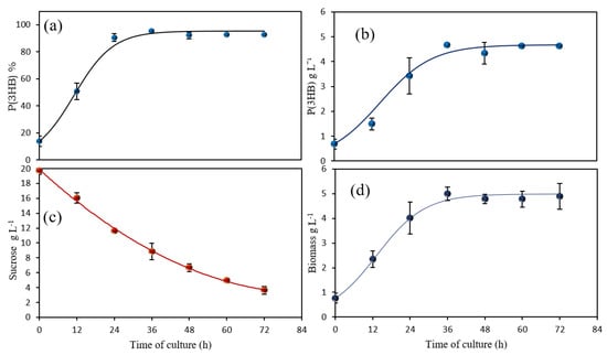 % P(3HB) accumulation on dry biomass (a), total concentration of P(3HB) (b), sucrose consumption (c), and biomass concentration (d) in cultures of the OP-PhbP3+ strain in a 3 L bioreactor.