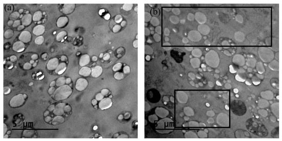 Transmission electron micrographs of strain OP-PhbP3+. (a) Cell morphology at 36 h of cultivation, showing intact cell structure and intracellular P(3HB) granules. (b) Cell morphology at 72 h of cultivation. P(3HB) granules released into the medium are indicated within the black boxes.