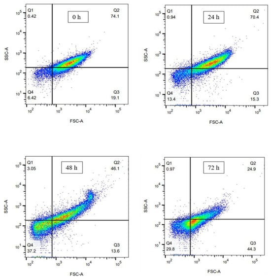 Finally, at 72 h of cultivation, the population profile shifted markedly. The proportion in Q2 dropped to 24.9%, while Q3 (44.3%) and Q4 (29.8%) increased substantially. These changes indicate an advanced stage of lysis, during which many cells have lost internal complexity or undergone structural collapse. The important decrease in Q2 suggests that a large portion of the population containing intracellular granules has already been degraded.