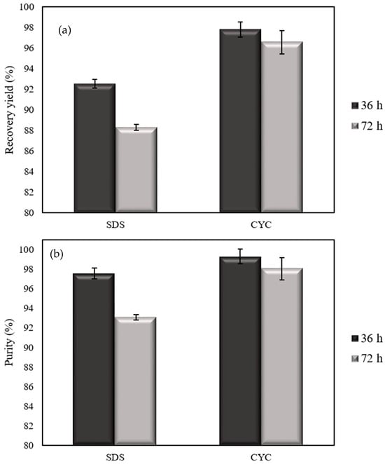 In addition, Figure 6a,b present the purity values obtained using both extraction methods. The highest purity was achieved with the CYC method using cells harvested at 36 h, reaching 99.3 ± 0.05%. This result slightly exceeds the value reported by Rosengart et al. [] who employed the same extraction method and B. sacchari DSM 17,165 as the production strain, achieving a purity of 98.2 ± 1.6%.