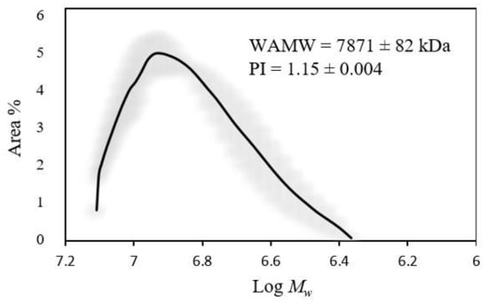 Figure 7 shows the molecular mass distribution of the polymer extracted from cells harvested at 72 h using the CYC method. The weight average molecular weight was 7871 ± 82 kDa, with a polydispersity index (PDI) of 1.15 ± 0.004, indicating a high and uniform molecular size distribution of P(3HB). In the present study, the values of weight average molecular weight obtained for P(3HB) films were comparable to those previously reported by Quiroz-Cardoso et al. [].