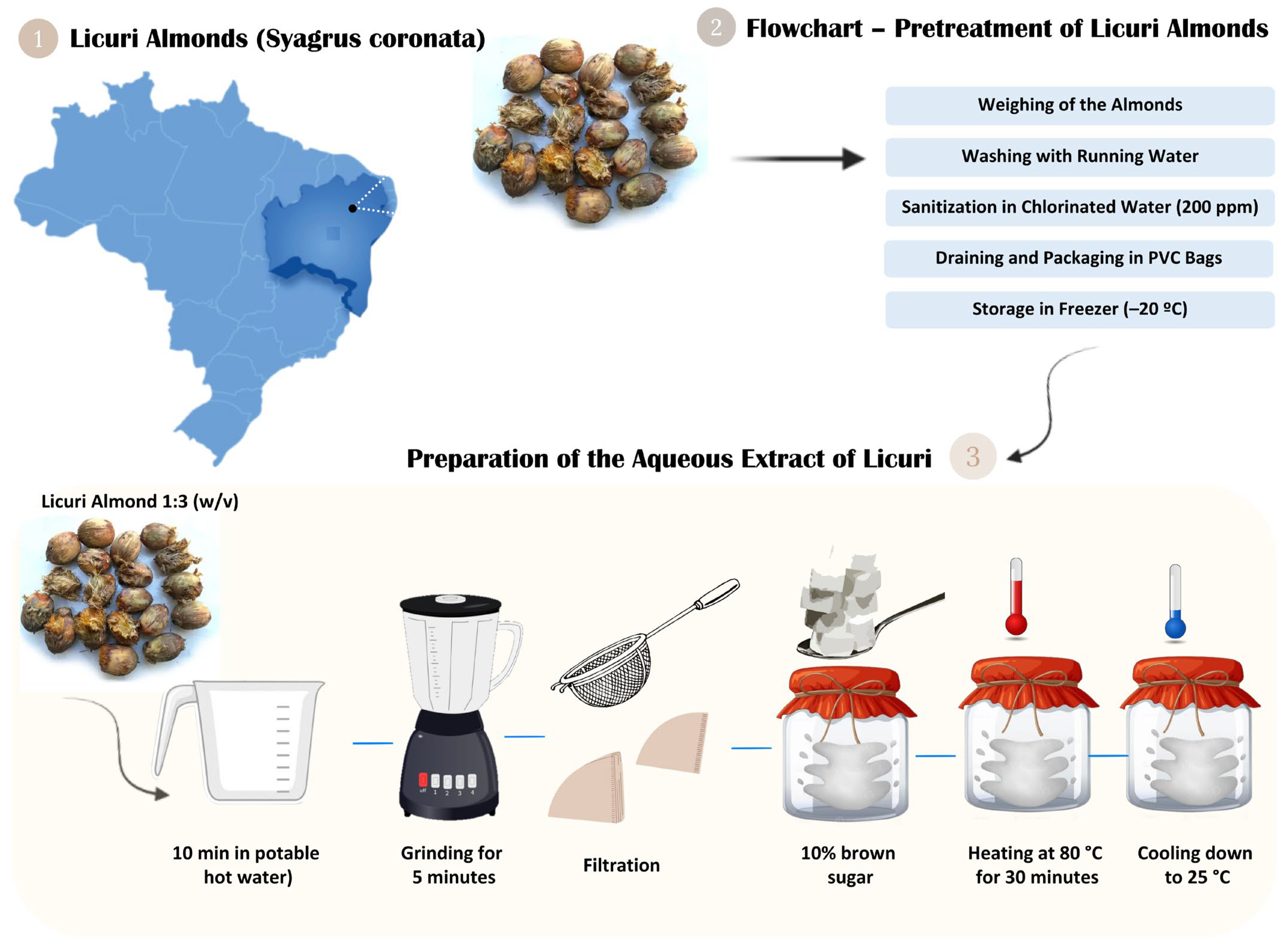 The licuri aqueous extract (LAE) was prepared by mixing the almonds with drinking water at a 1:3 (w/v) ratio, followed by heating for 10 min. The mixture was homogenized for 5 min using a Mondial Easy Power 550 W blender (Mondial, Conceição do Jacuípe, Brazil), then filtered through a sieve and filter paper. Brown sugar (10%, w/v) was added, and the extract was manually pasteurized on a hot plate (Cientec CT 339, Cientec, Sao Paulo, Brazil) using a thermometer (Deltt DT-650, Sao Paulo, Brazil) to maintain 85 °C for 30 min, then cooled to 25 ± 2 °C [13]. The complete procedure is illustrated in Figure 1.