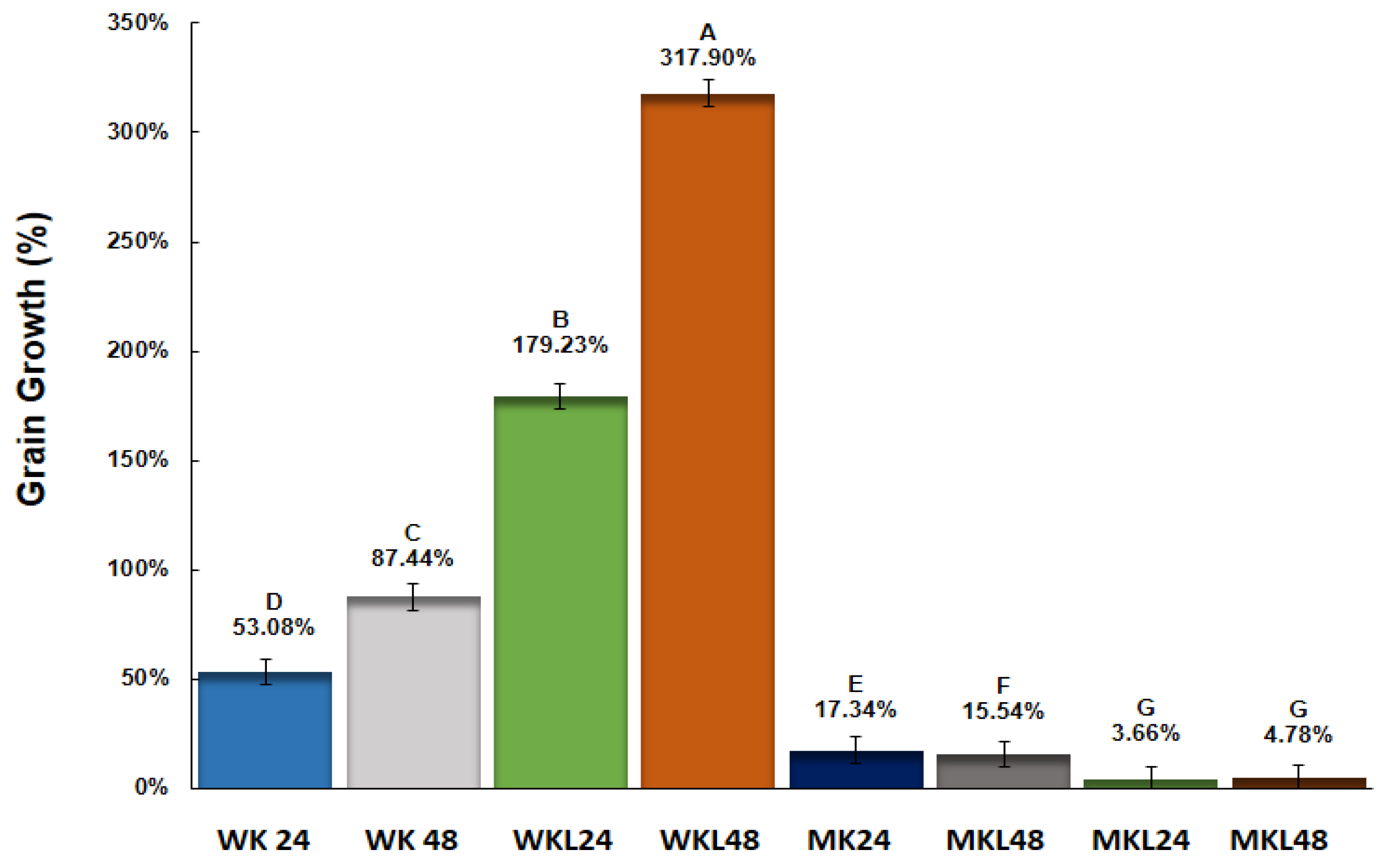 Figure 2. Percentage growth of water and milk kefir grains in the substrates: milk, sucrose solution, and LAE (10% sucrose). Superscript letters indicate statistically significant differences between treatments (p < 0.05, as determined by ANOVA followed by Tukey’s test).