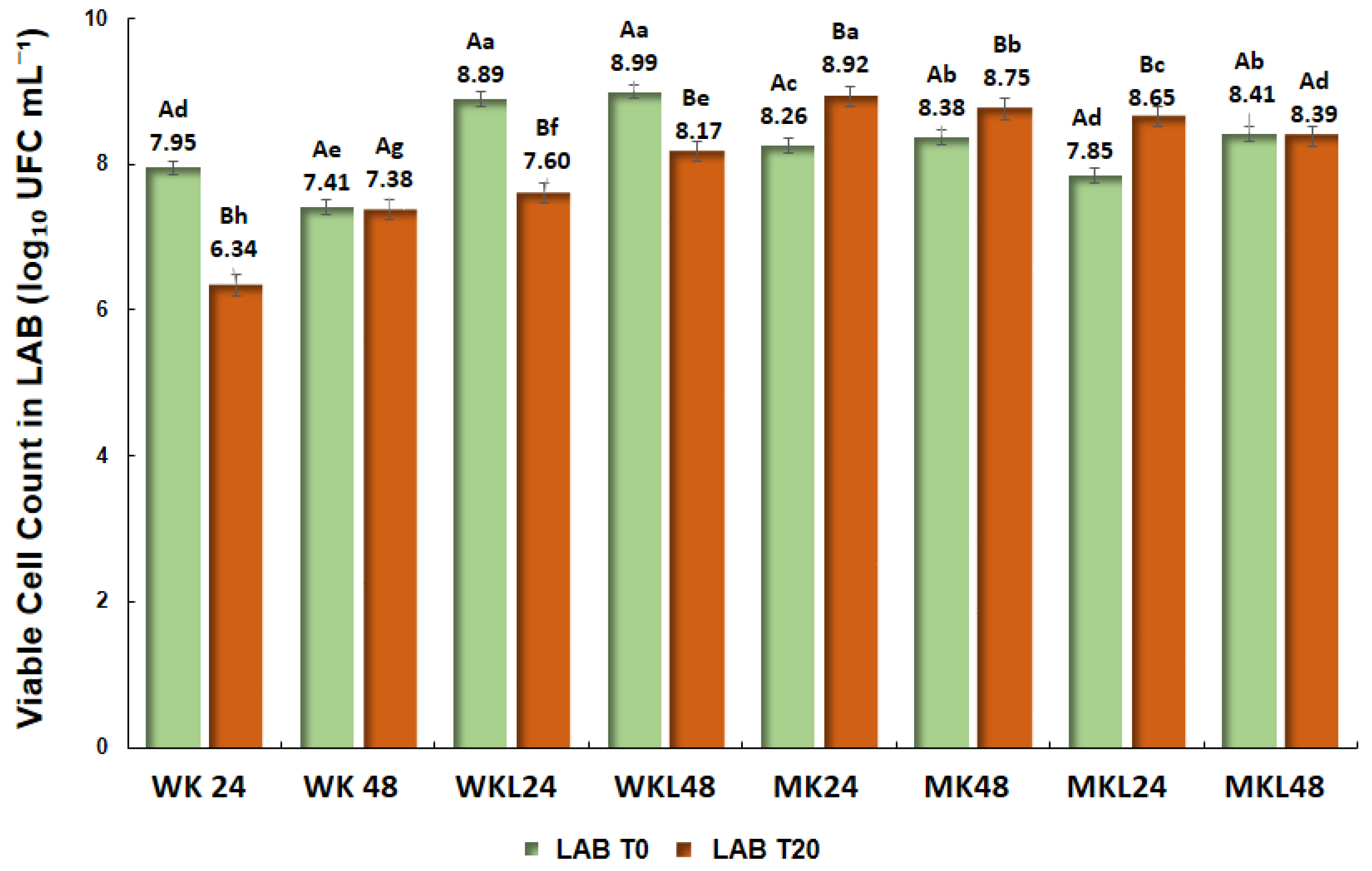 Figure 3. Viable cell count of lactic acid bacteria (LAB) at the beginning (T0) and after 20 days (T20) of storage at 4 °C of kefir-based fermented beverages. Uppercase letters indicate significant differences (p < 0.05) between storage times (T0 and T20) within the same sample, while lowercase letters indicate significant differences among all treatments (p < 0.05, ANOVA followed by Tukey’s test).