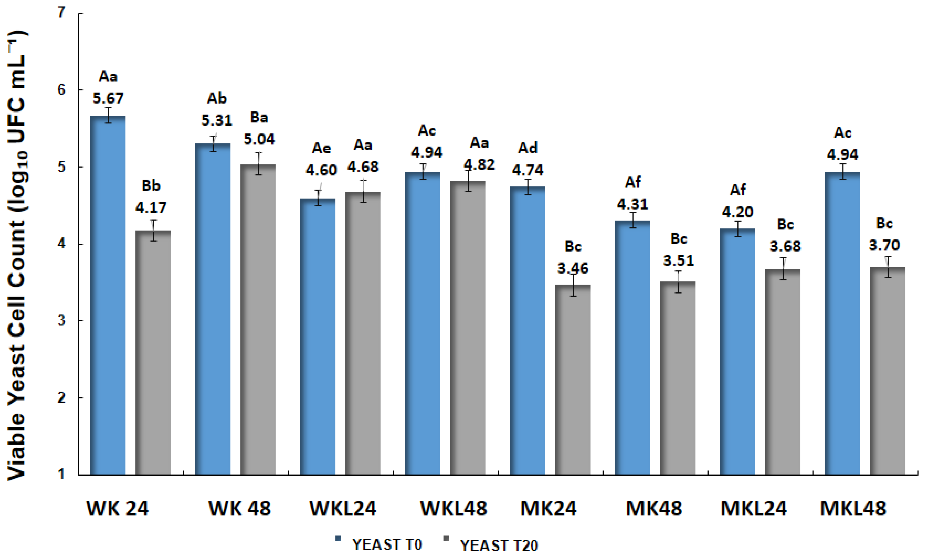 Figure 4. Viable yeast cell count at the beginning (T0) and after 20 days (T20) of storage at 4 °C of the same fermented beverages. Uppercase letters indicate significant differences (p < 0.05) between storage times (T0 and T20) within the same sample, while lowercase letters indicate significant differences among all treatments (p < 0.05, ANOVA followed by Tukey’s test).