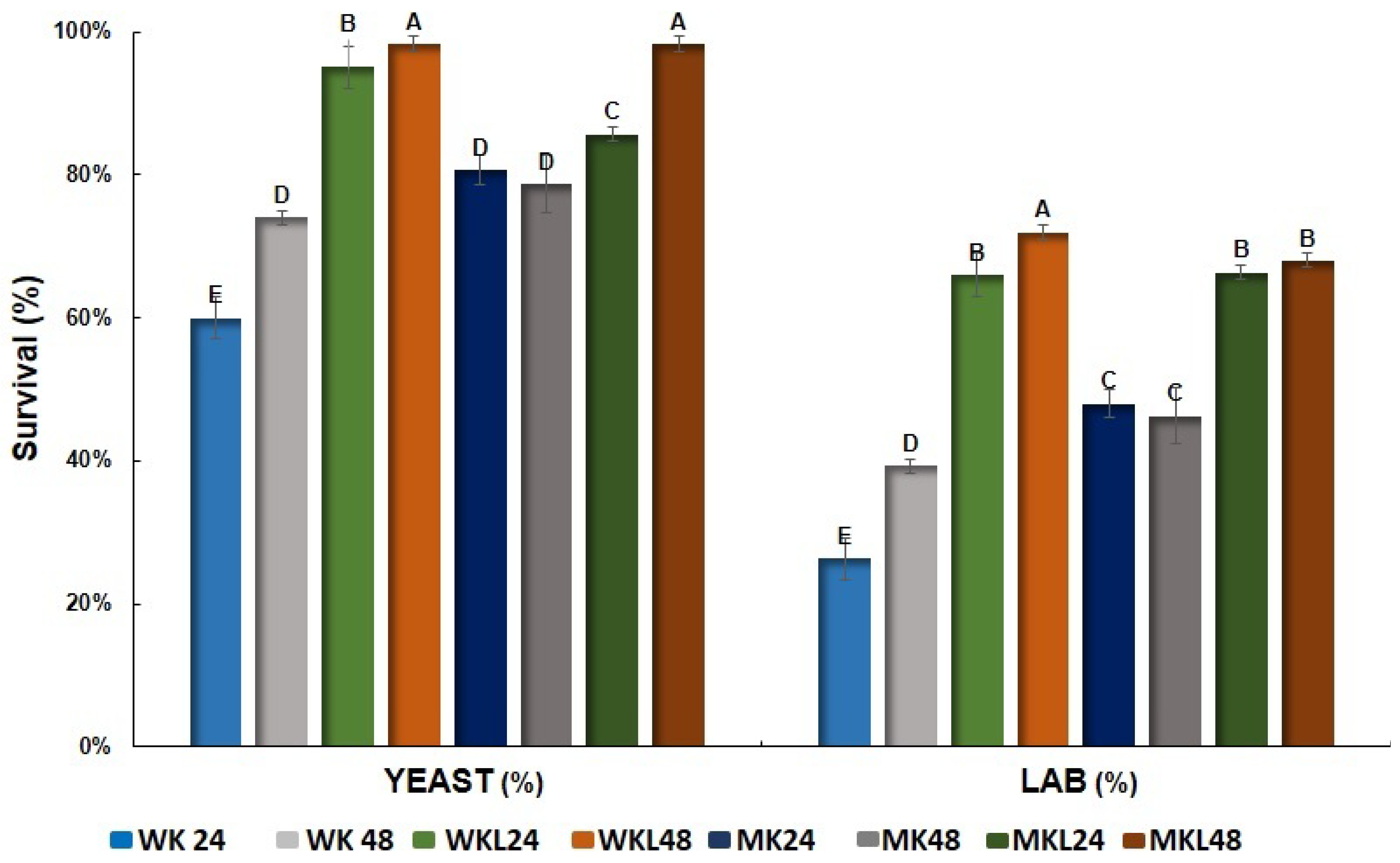 Figure 5. Survival (%) of lactic acid bacteria (LAB) and yeasts after exposure to simulated gastrointestinal tract (GIT) conditions in kefir-based fermented beverages. Different letters indicate significant differences among samples (p < 0.05, ANOVA followed by Tukey’s test). Error bars represent mean ± SD.