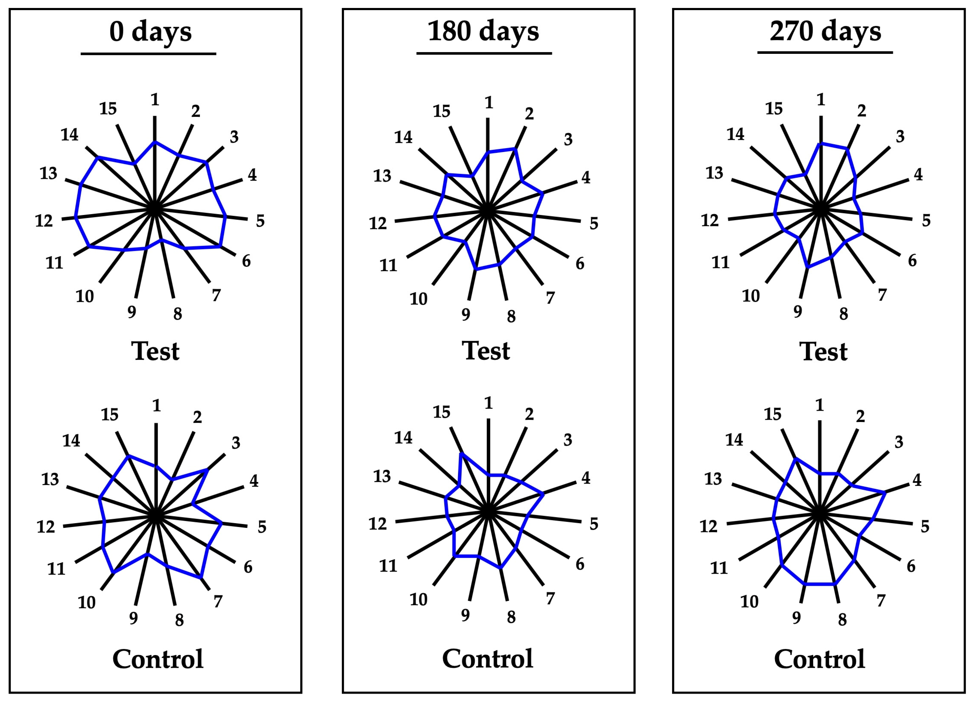Figure 2. Sunray plot representing the major volatile compounds footprints obtained by multivariate analysis (MVA) of control and test samples at 0, 180, and 270 days of biological aging. 1: Acetaldehyde; 2: Ethyl acetate; 3: 1,1-Diethoxyethane; 4: Methanol; 5: 1-Propanol; 6: Isobutanol; 7: 2-Methyl-1-butanol; 8: 3-Methyl-1-butanol; 9: Acetoin; 10: Ethyl lactate; 11: 2,3-Butanediol (levo); 12: 2,3-Butanediol (meso); 13: Diethyl succinate; 14: 2-Phenylethanol; 15: Glycerol. Each ray represents the mean concentrations ± three standard deviations of the volatile compounds quantified.