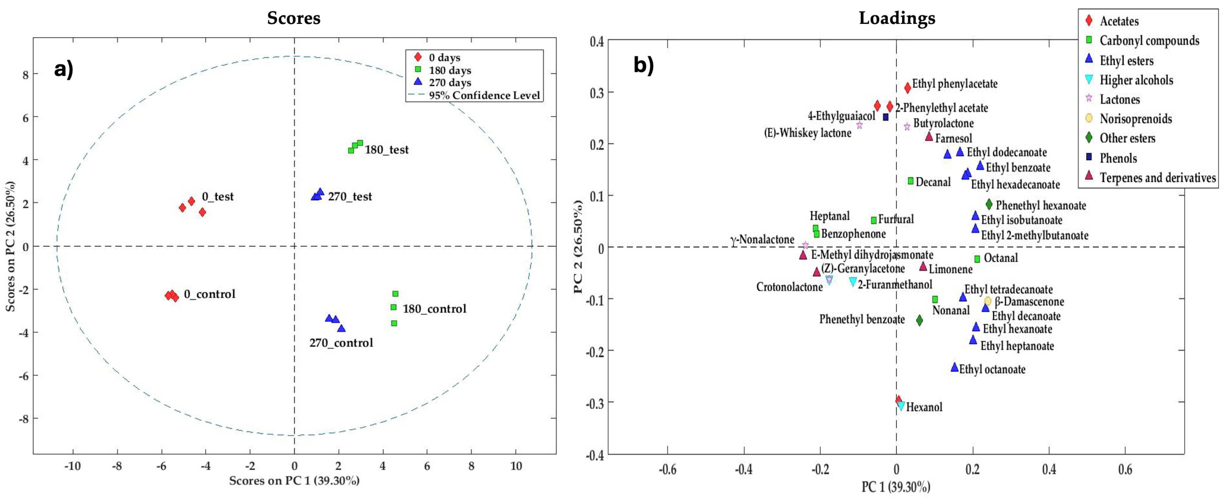 Figure 3. Principal component analysis (PCA) of minor volatile compounds: (a) score plot showing the distribution of control and test samples at 0, 180, and 270 days of aging along the first two principal components (PC1 and PC2) and (b) loading plot illustrating the contribution of minor volatile compounds to PC1 and PC2.