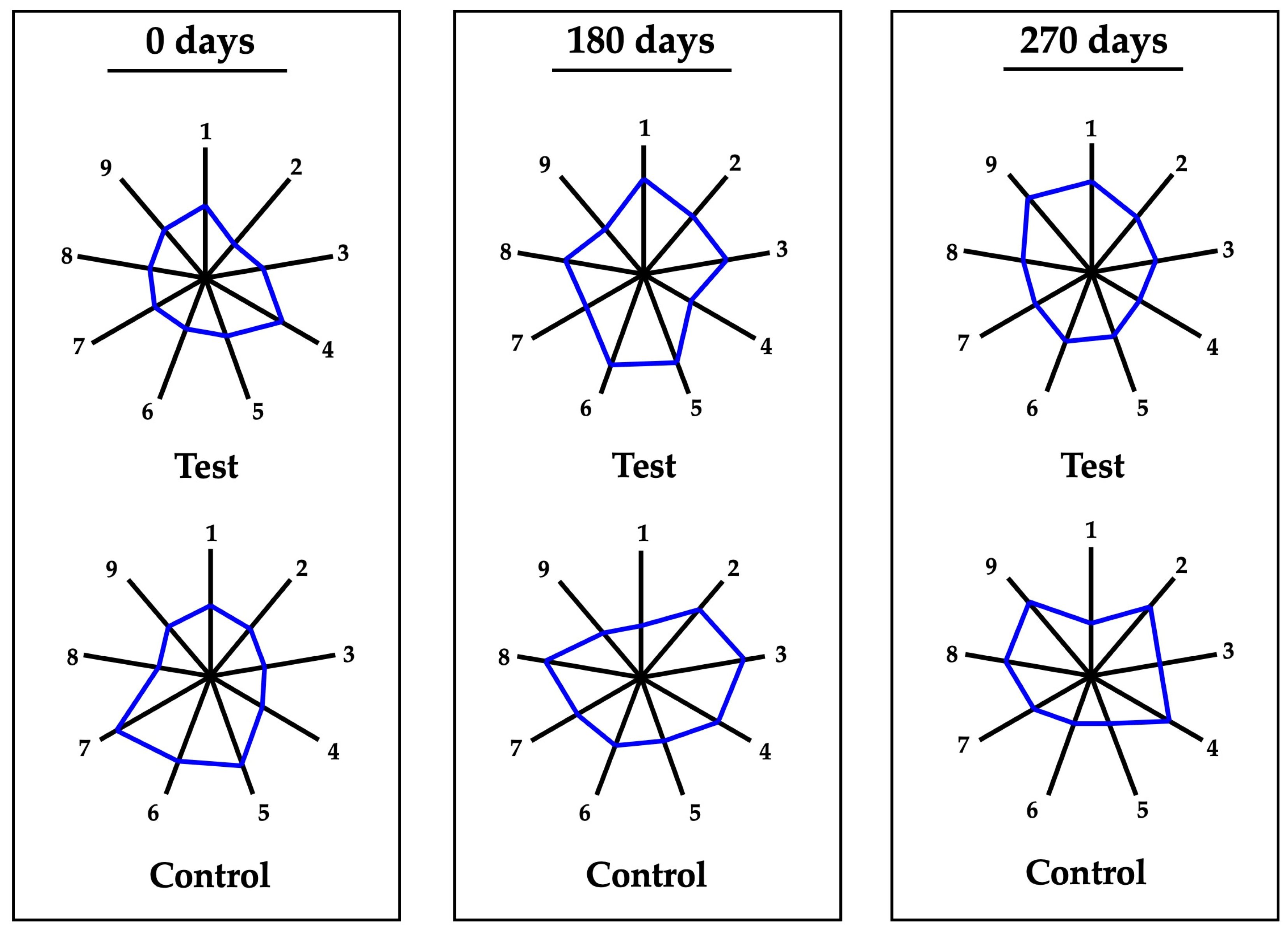 Figure 4 shows that the test wine displays a more balanced polygon shape compared to the control. Certain chemical families are more prominent in the control wine, particularly at the beginning of the study. At day 0, the control wine exhibited higher concentrations of carbonyl compounds (7), ethyl esters (2), lactones (6), and phenols (5), whereas the test wine showed relatively higher levels of acetates (1) and higher alcohols (4). By 180 days, test wine showed broader and more balanced distributions and notable increases in acetates (1), ethyl esters (2), phenols (5), lactones (6), and norisoprenoids (8), suggesting intensified esterification processes and enhanced aromatic complexity. Regarding 0 days, the control also increased in esters (2, 3), higher alcohols (4) and norisoprenoids (8), but showed lower acetates (1), phenols (5), lactones (6) and carbonyl compounds (7). At 270 days, the test wine maintained elevated levels of esters (1, 2, 3), and norisopenoids (8) while terpenes and derivatives (9) increased. The control wines decrease their contents in ethyl and other esters (2, 3) and lactones (6), mainly. These trends suggest the test treatment promoted both maturation and preservation of key aroma families, while the control experienced volatile loss. Such chemical stability in the test is likely to sustain fruity, floral, and complex sensory attributes provided by the volatile compound over extended storage.