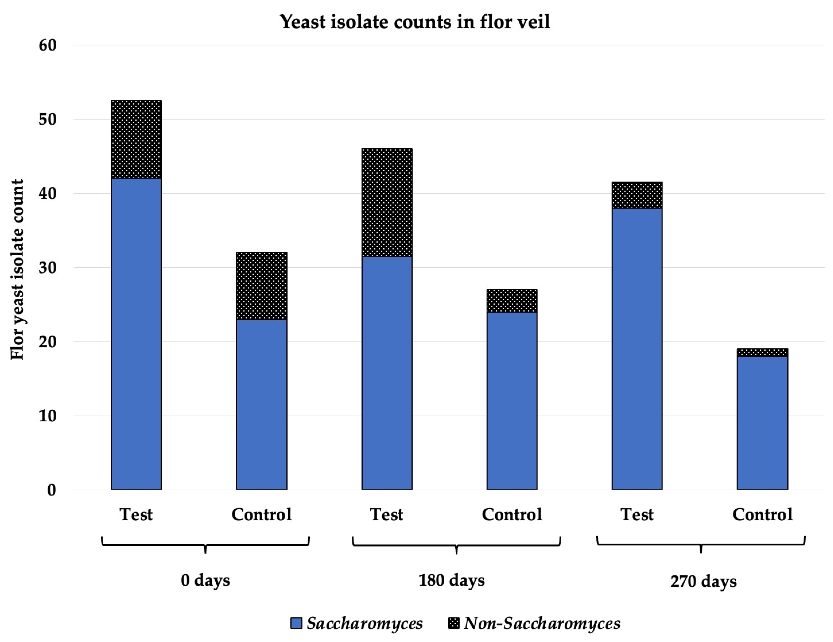 Figure 5. Yeast isolate counts in flor veil in the “test” and “control” samples at 0, 180, and 270 days. Bars represent the total number of isolates, with Saccharomyces species shown in blue and non-Saccharomyces species in black.