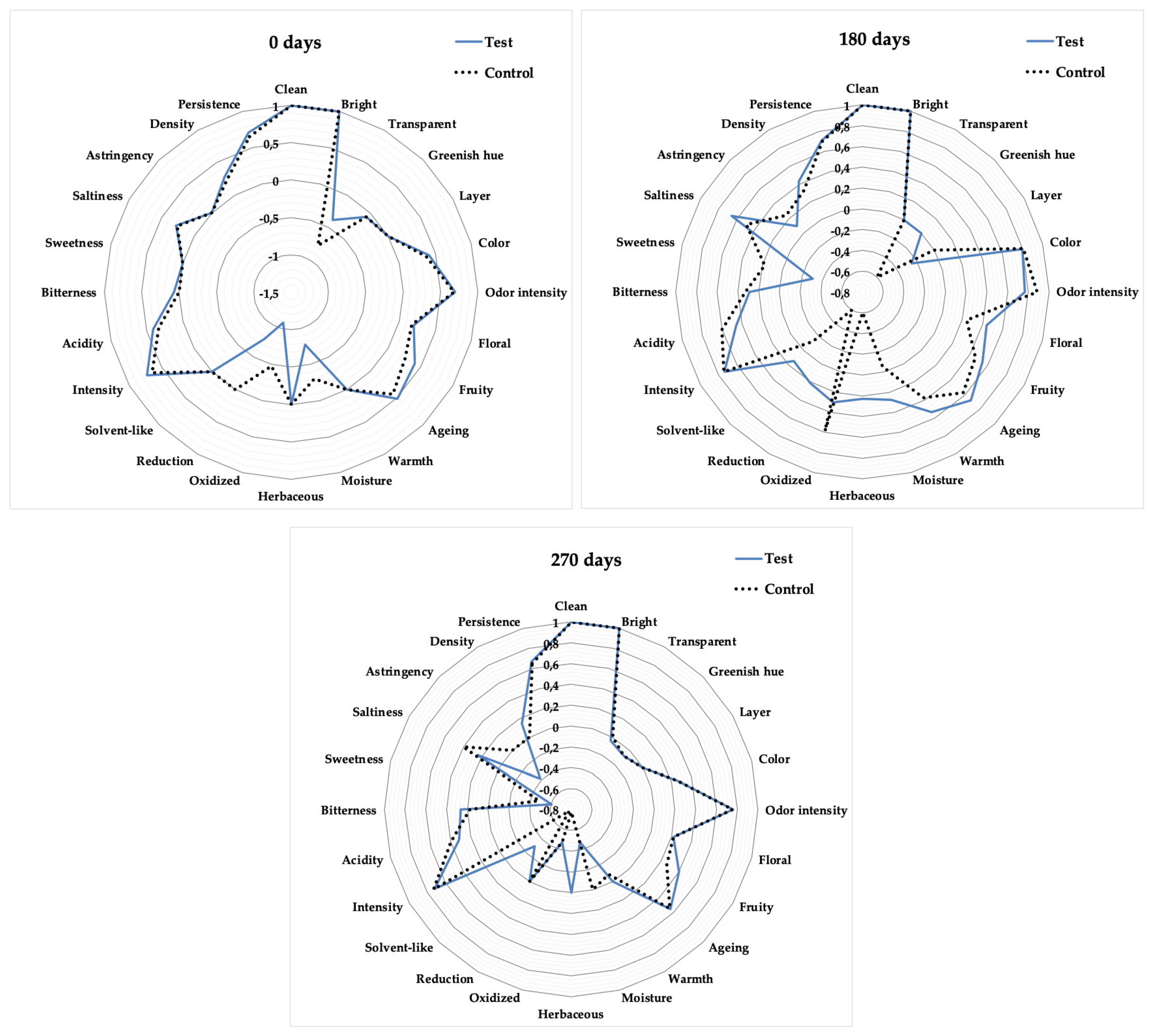 Figure 6. Radar plots showing the logarithmic transformation of the mean intensity values for 24 sensory attributes in biologically aged wines with reduced ethanol content (test) and traditional ethanol content (control), evaluated at 0, 180, and 270 days of aging.