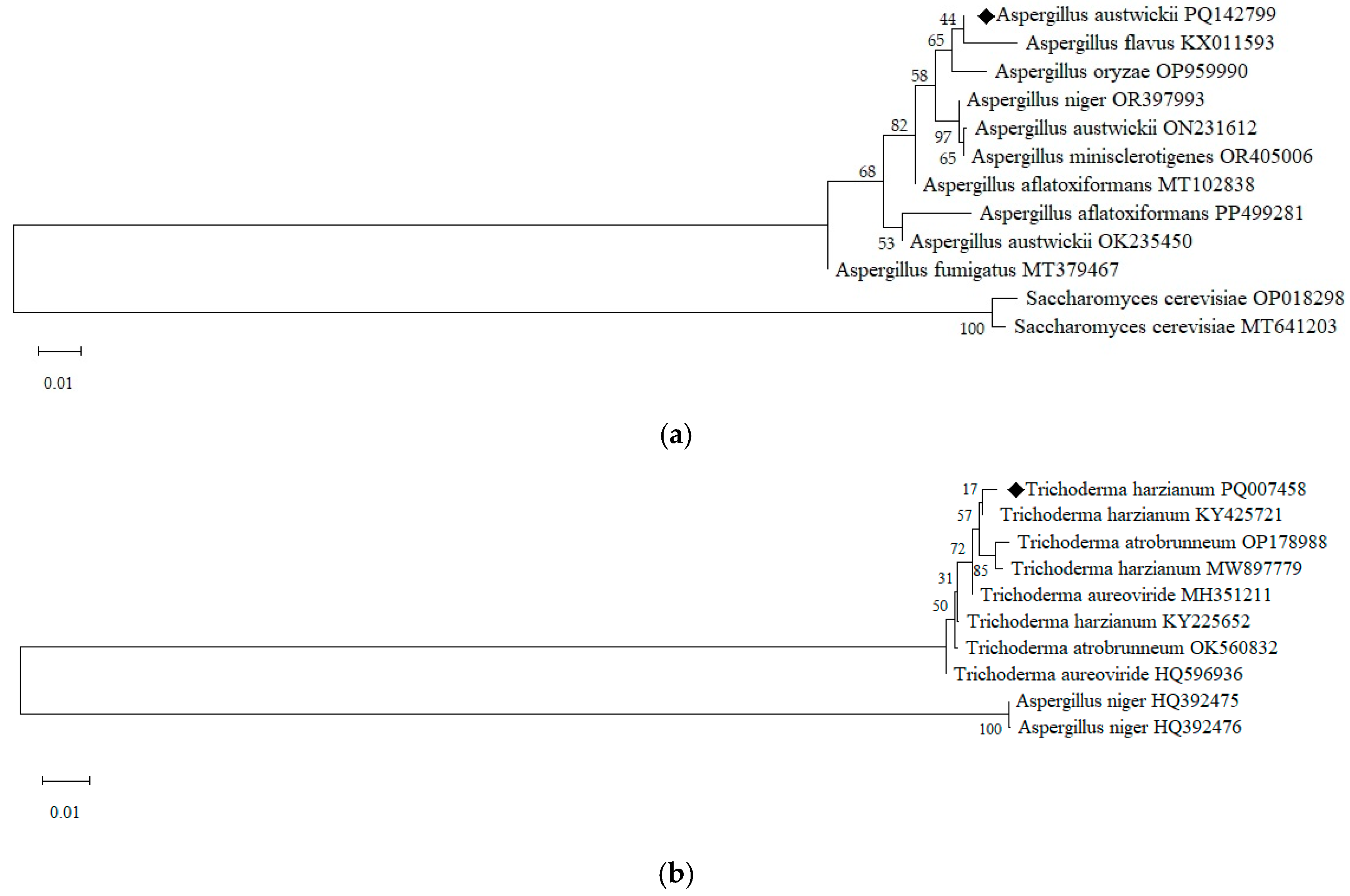 - White, T.J.; Bruns, T.; Lee, S.; Taylor, J. Amplification and Direct Sequencing of Fungal Ribosomal RNA Genes for Phylogenetics. In PCR Protocols; Academic Press: New York, NY, USA, 1990; pp. 315–322. ISBN 978-0-12-372180-8. [Google Scholar] [CrossRef]