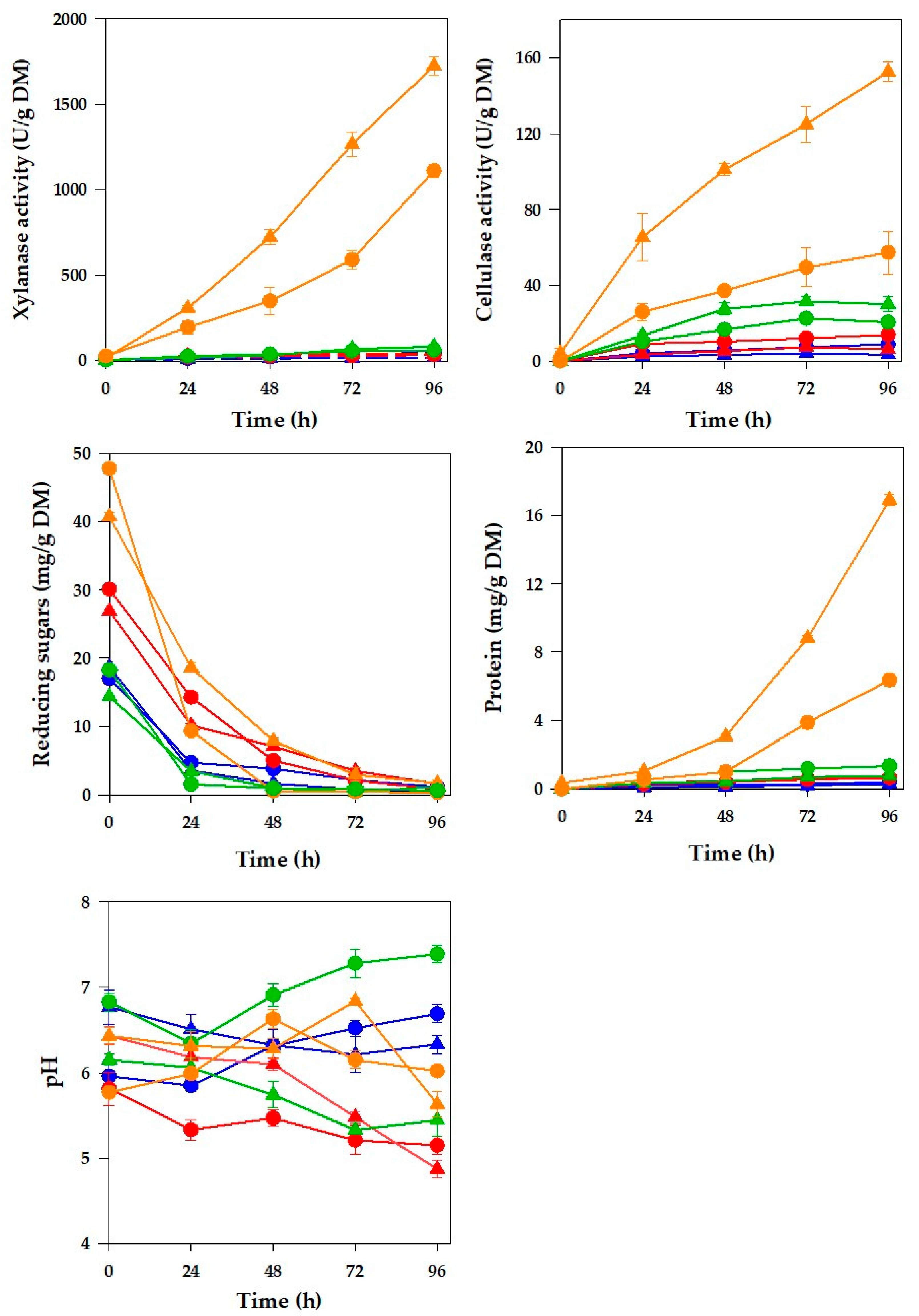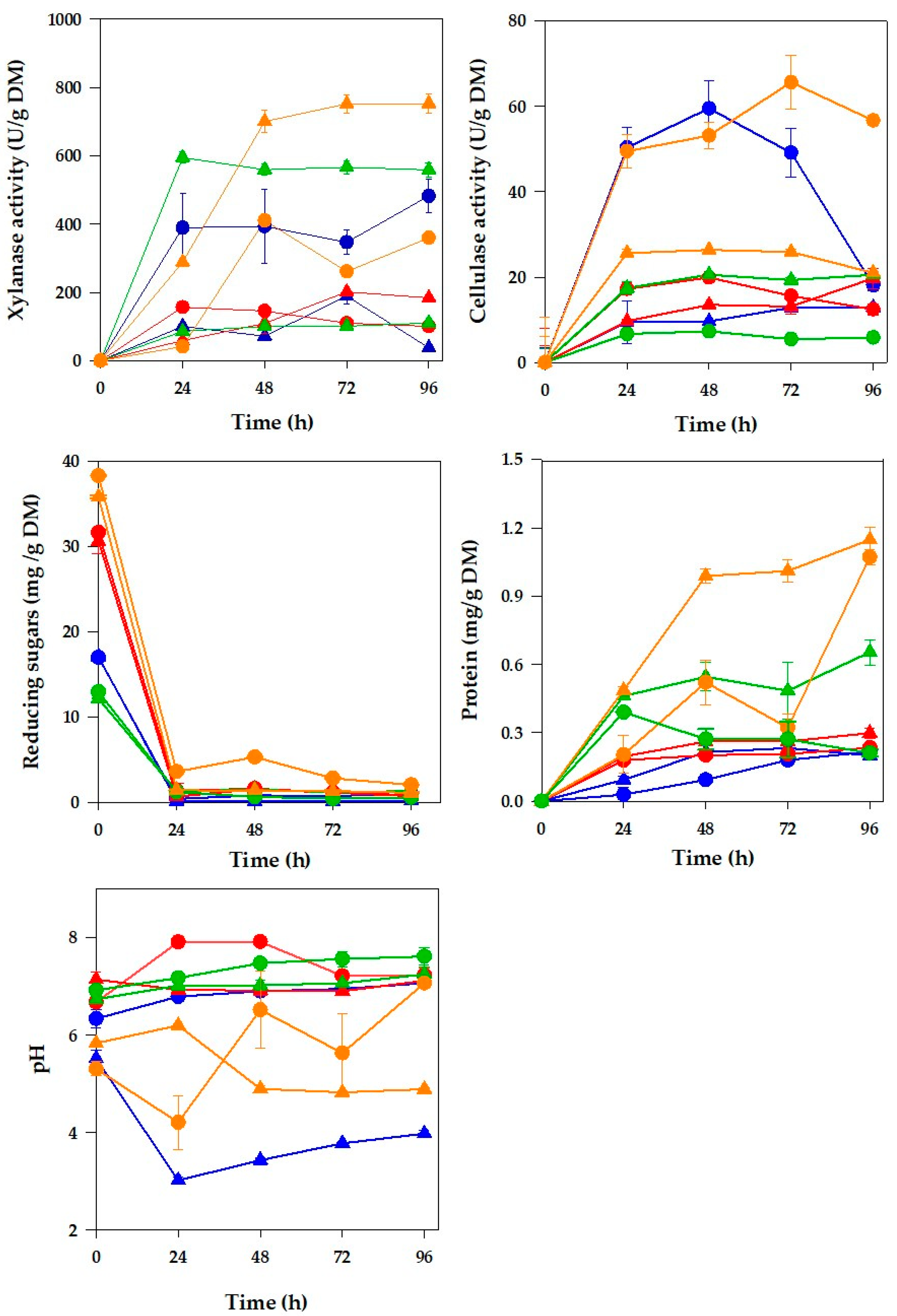 - Yang, S.Q.; Yan, Q.J.; Jiang, Z.Q.; Li, L.T.; Tian, H.M.; Wang, Y.Z. High-Level of Xylanase Production by the Thermophilic Paecilomyces themophila J18 on Wheat Straw in Solid-State Fermentation. Bioresour. Technol. 2006, 97, 1794–1800. [Google Scholar] [CrossRef] [PubMed]