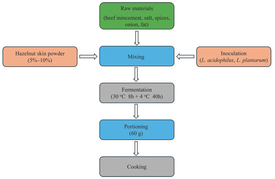 The basic mechanism of fermented meat products entails the incorporation of particular microorganisms, primarily lactic acid bacteria (LAB), which play a significant role in fermentation processes. LABs exhibiting probiotic properties, such as Lactobacillus acidophilus, are commonly used due to their ability to produce acid, which lowers the pH of the environment and inhibits the growth of pathogenic microorganisms, thereby enhancing food safety [12]. Probiotic cultures also contribute to the health benefits associated with fermented meat products, as they can improve gut health and nutritional value [12,13].