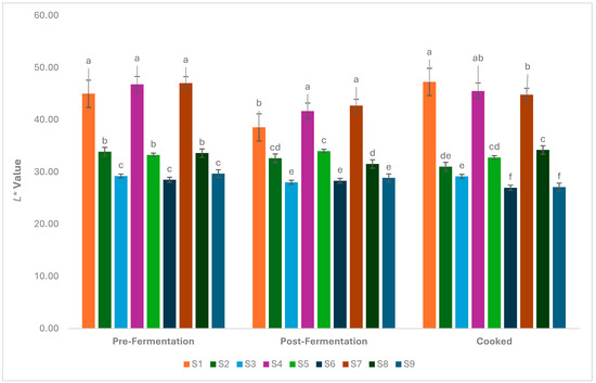 Change in L* values during the production of the burger samples (S1–S9). a–f: Values with the different lowercase letters on the bars for each analysis differ significantly (p < 0.05).