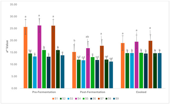 Change in a* values during the production of the burger samples (S1–S9). a–d: Values with the different lowercase letters on the bars for each analysis differ significantly (p < 0.05).
