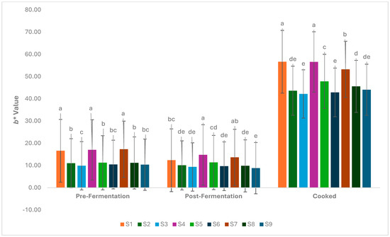 It was determined that the addition of hazelnut skin powder caused a change in the a* values, which indicate the degree of redness-greenness in foods, similar to the L* values (p < 0.05). The highest a* value was detected in samples without powder addition (Figure 3). However, there was a slight decrease in a* values in the post-fermentation and post-cooking samples. The b* value, which indicates the degree of yellowness and blueness, decreased in parallel with the amount of powder added (p < 0.05). The highest b* values were determined in samples S1, S4, and S7 (without added hazelnut skin powder), while the lowest b* values were determined in samples S3, S6, and S9 (Figure 4). A significant increase in b* values was observed after cooking. The high temperatures associated with frying can increase the Maillard reaction, leading to browning and subsequently more intense yellow tones. Su [40] emphasised that frying causes an increase in b* values in burgers and indicates an increase in yellowness.