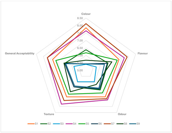 The sensory qualities of the burgers were evaluated based on colour, odour, flavour, texture and general acceptability parameters (Figure 5). The sample that received the highest scores for general acceptability, colour and flavour was sample S7. Sample S4 received the highest scores for odour and texture. The species of lactic acid bacteria inoculated and the amount of skin powder added affected the sensory qualities (p < 0.05). The lowest-scored sample was the S3 sample. When the results were examined, as the amount of added skin powder increased, there was a decrease in sensory qualities. Hazelnut skin powder is also recognised for its richness in phenolic compounds, which are associated with antioxidant properties that can improve sensory characteristics such as freshness and flavour stability [59,60]. For example, Costantini et al. [61] found that adding 5% hazelnut skin powder to lentil crisps improved both their nutritional and sensory properties and supported their potential positive effect in product preparations. Nevertheless, it is advised to use them with caution, since excessive use of such additives may result in sensory decline, and [62] indicated that increasing the amount of plant-based additions resulted in a decreased overall acceptance of sausages.