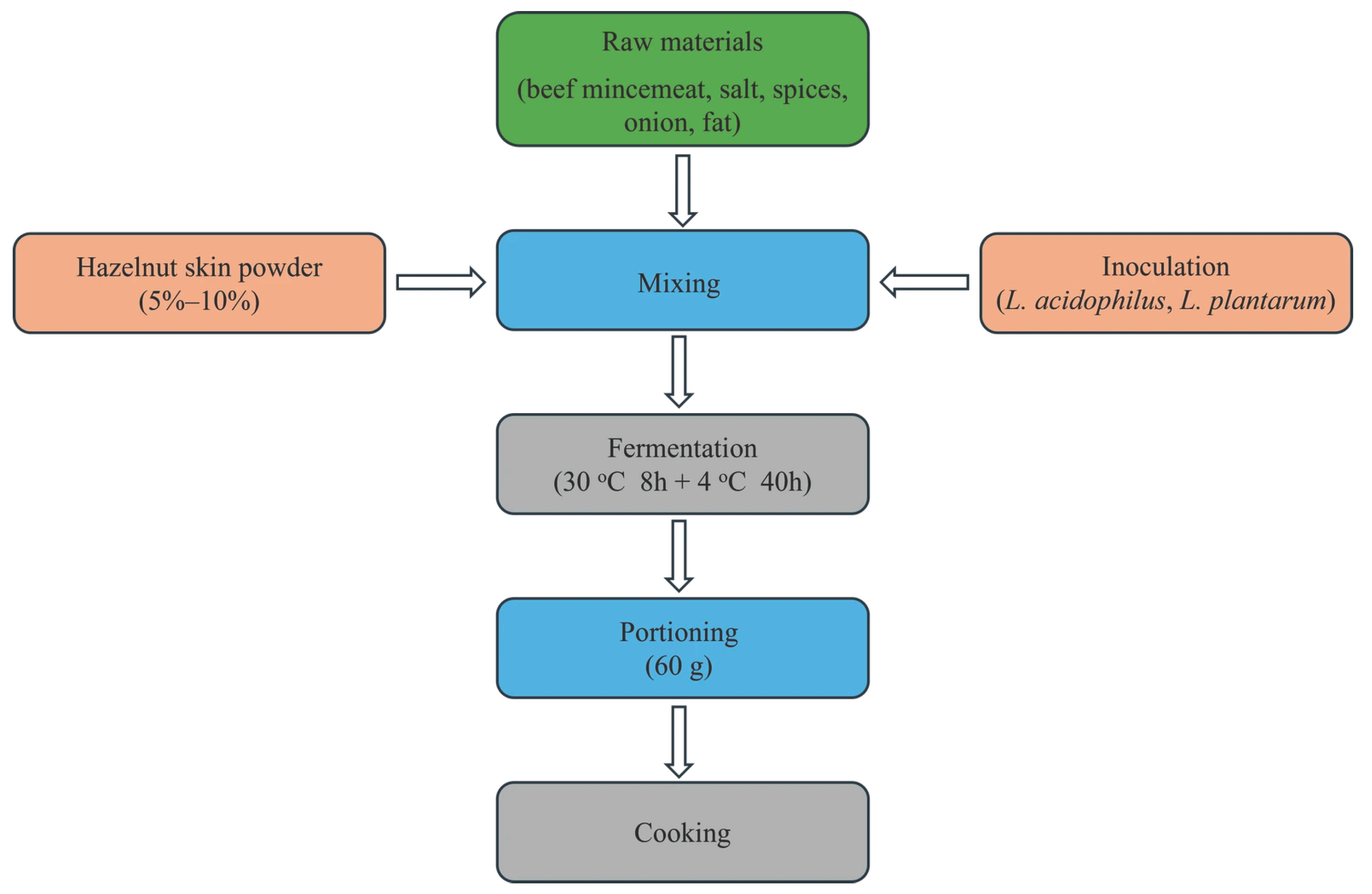 Atik, İ. Enhancing the Functionality of Beef Burgers Enriched with Hazelnut Skin Powder Through Fermentation. Fermentation 2025, 11, 586. https://doi.org/10.3390/fermentation11100586