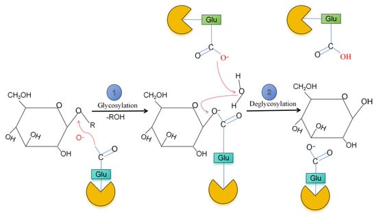 β-glucosidase catalyzes the cleavage of β-1,4 glycosidic bonds using a retention type catalytic mechanism, that is, the stereochemical configuration of glycosidic bonds remains unchanged after the hydrolysis reaction. As shown in Figure 1, two conserved glutamic acid residues (Glu) are used as the key catalytic sites: one acts as a nucleophile to attack the anomeric carbon (C1) of the substrate, resulting in the cleavage of the glycosidic bond and the formation of a covalent enzyme-substrate intermediate (oxygen–carbon positive ion transition state). The other acts as a proton donor, which promotes the cleavage of the bond by protonating the oxygen atom of the glycosidic bond. Although both the conversion and retention mechanisms use two main catalytic residues, there are differences. The inversion and retention depend on the change in the anomeric carbon configuration of the glucose moiety. At present, the reversal mechanism is only observed for the GH9 enzyme, but the GH1, 2, 3, 4, 5, 30, 39 and 116 families follow the retention mechanism [16]. The retention mechanism of the GH1, GH2, GH3, GH4, GH5, GH30, GH39 and GH116 families includes two consecutive steps of glycosylation and deglycosylation [17].