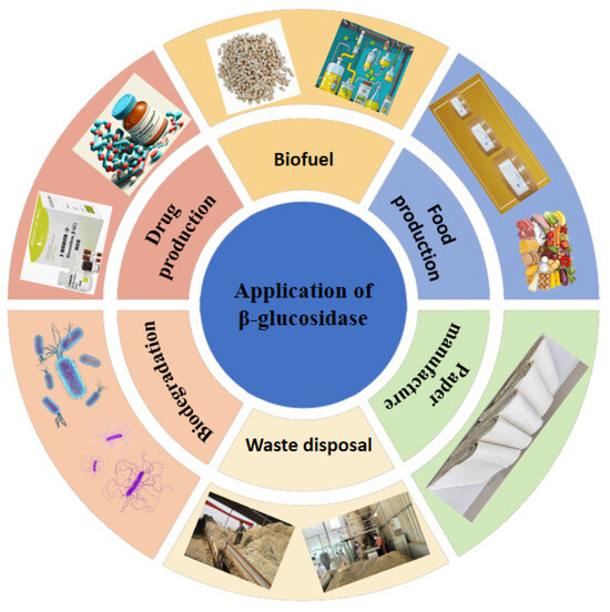 β-glucosidases are a group of heterogeneous hydrolases with good characterization and biological importance. They act on different substrates and have been widely used in biotechnology. They play a diverse role in the industry, from promoting the conversion of cellulose into fermentable sugars in biofuel production, to enhancing flavor and aroma in the food industry, to the synthesis of pharmaceutical ingredients in the pharmaceutical field, and to the application in industries such as feed, cosmetics and environmental governance. It improves production efficiency and promotes product innovation by catalyzing key biochemical reactions. Its application involves many aspects as shown in Figure 2, including biofuel production, application in the food industry, pharmaceutical industry, paper industry, waste treatment, biodegradation, etc.