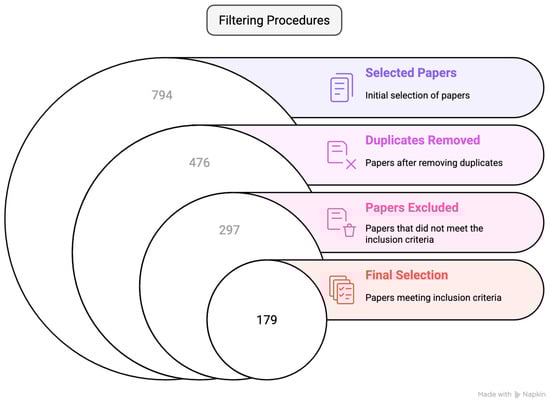 Searches were performed in SCOPUS and Web of Science databases using combinations of the most relevant terms that was established in two keyword blocks (using the Boolean operators “OR” and “AND”, as well as quotation marks and the asterisk wildcard character): Block 1 (kombucha OR “fermented tea”) AND Block 2 (scoby OR biofilm OR *cellulose OR “acetobacter xylinum”), applied to titles, abstracts, and keywords. After duplicate removal and screening based on language and scope criteria, 794 articles were initially retrieved, and 179 were retained for evaluation (Figure 2).