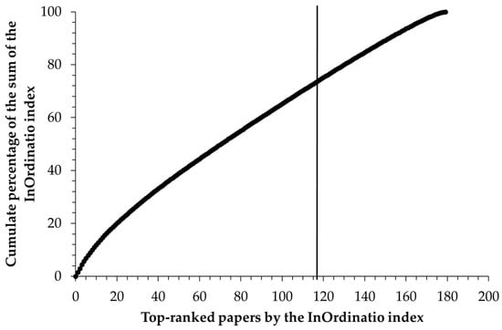 In this review, from the 179 articles found on the subject of “scientific advances and innovative applications involving kombucha-derived SCOBY”, 117 articles were selected to perform the analysis. The selection was based on the InOrdinatio index (Equation (1)). To assess representativeness, the InOrdinatio values of all papers with a score (179 papers) were summed, and the cumulative percentage of this total was calculated for each article, starting from the highest score (Figure 3). Notably, the 117 selected articles accounted for approximately 70% of the total InOrdinatio value, demonstrating that the chosen sample is highly representative of the most relevant literature on the topic.