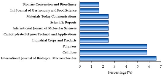 It is important to note that the journal International Journal of Biological Macromolecules (impact factor 7.7) published two of the top 10 articles. Moreover, it was the most frequently occurring journal among the 117 articles analyzed, representing 6.6% of the total (8 occurrences) within a sample of 87 different journals, demonstrating its strong relevance to the research topic (Figure 4). It was followed by the journals Cellulose (impact factor 4.9) and Polymers (impact factor 4.7) in frequency, with both journals accounting for 5.79% (7 occurrences) each of the total samples.
