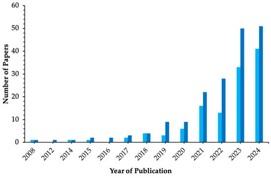 Among the 117 articles included in our sample, an exponential increase in scientific production related to the applications of SCOBY from kombucha was observed. This growth reflects that the interest in SCOBY is not only related to the production of kombucha itself, but also as a material with potential applications beyond its traditional use. A marked increase in publications was observed over the past four years (2020–2024), both among the 117 selected studies and within the total of 179 articles that met the inclusion criteria for this review (Figure 5). The earliest identified publication dates back to 2008 [], and it is notably ranked among the top 10, according to the InOrdinatio index, due to its high number of citations. This outcome aligns with the weight given to citation count in the InOrdinatio equation, reflecting our intent to balance the inclusion of both recent studies and highly cited works.