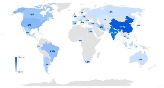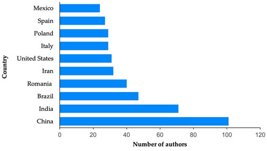In total, 39 countries participated in boosting scientific contributions on the perspectives of using SCOBY from kombucha, with 659 authors. Figure 6 shows the scientific contribution of each country, with China (14.01%) leading, followed by India (11.46%), and then the United Kingdom and the United States, both with 5.10%. Brazil is in fifth place with 4.46%. However, when we examine the individual number of authors per country (Figure 7), China and India remain in first and second place, but Brazil moves up to third. Additionally, other countries show a different level of participation when considering the total number of researchers. For instance, Romania moves from 14th to 4th place, while Iran advances from 8th to 5th position, as compared to the ranking presented in Figure 6. This difference may be attributed to the collaborative nature of scientific production in certain countries. Nations such as Brazil, Romania, and Iran, although ranking lower in total number of publications, demonstrate a higher number of contributing authors, suggesting a stronger presence in collaborative or multi-institutional research efforts. This pattern may also reflect larger research groups or broader participation in joint international studies.
