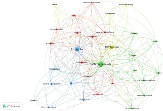 Keyword network map, from VOSviewer, of the 117 selected papers related to the scientific advances and innovative applications involving SCOBY, derived from kombucha fermentation.