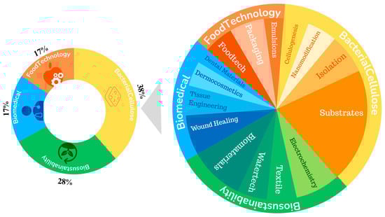 In a sample of 117 articles, four main application sectors for kombucha-derived SCOBY were identified (Figure 9). The most prominent was the production of bacterial cellulose (38%), with emphasis on optimizing production processes [,,,], developing more accessible and cost-effective cultivation methods [], and exploring alternative substrates beyond sucrose and green/black tea to improve yield and sustainability [,,,,,,,,,,,,,,,,,,,,]. Studies in this category also focused on microbial identification and isolation [,,,,,,], as well as post-processing modifications such as the transformation of bacterial cellulose into nanocellulose to enhance its value and range of applications [,,,,]. The application of SCOBY as a biosustainable material (28%) was the second most reported sector, highlighting its potential to replace synthetic products that pose risks to both the environment and human health. These innovations respond to current demands in areas such as electronics [,,,,,,,], textiles [,,,,,,,], water treatment [,,,,,,], and plastic alternatives [,,,,,,,]. SCOBY was also explored in biomedical innovations (17%), including applications in wound healing [,,,,,,], tissue engineering [,,,,], dermocosmetics [,], and dental materials [,,,], due to its biocompatibility and structural versatility. Lastly, food sector applications (17%) extended beyond kombucha production, encompassing culinary uses [,,,,,,], active packaging [,,,,,,], and roles in Pickering emulsions and delivery systems [,,,].